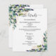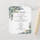 Um moderno e elegante programa/programa/cronograma de casamento. Um fundo branco decorado com verde de eucalipto e folhagem de ouro. Personalize e adicione seus nomes e detalhes do casamento. Letras pretas coloridas. Texto de ambos os lados. Adicione o URL do seu site de casamento ao código QR no verso. 1 folha = 1 programa impresso borda a borda.