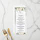Este é o cardápio de casamento moderno da boêmia que apresenta folhagem verde e eucalipto e rosas brancas brilhantes de ouro acentuado em fundo de aquarela