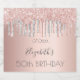Para uma festa de aniversário feminina e glamourosa 50ª (ou qualquer idade) com as meninas. Um fundo metálico rosa dourado falso com aspecto elegante, rosa dourado falso, gotas cor-de-rosa e prata, pintura gotejando. O texto: O nome é escrito em cinzas escuras com um grande script de estilo escrito à mão moderno. Personalize e adicione um nome, 50 anos e uma data. Data de nascimento ou data da festa.