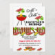 Convide seus hóspedes para uma festa de aniversário de churrasco no quintal com este charmoso convite para picadas coberto de videira com melancia fresca, grelhadora de CHURRASCO e milho no convite para o berço.