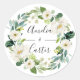 Adesivo Redondo Clássico Casamento com uma grinalda de flores brancas aquarela com folhagem verde. Para personalização avançada deste design, por favor clique no botão "Personalizar". Itens correspondentes também estão disponíveis.