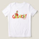 This vibrant and bold graphic is the perfect logo for the holiday mischief-maker! The word "GRINCH!" is displayed in large, stylized letters, primarily in festive red and lime green. The Grinch himself (in his Santa suit) stands right over the letters with his hands on his hips, looking mischievously proud. Beside him, his loyal partner, Max the Dog (complete with reindeer antlers), sits patiently. This fun graphic is a great way to celebrate the iconic characters and their story!