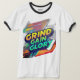 Esta design de camiseta atraente apresenta a frase motivacional "Grind, Gain, Glory" em uma fonte ousada e multicolorida. O design incorpora linhas e formas dinâmicas, criando um sentido de energia e movimento. Seria um excelente adicional a qualquer guarda-roupa e serviria como um lembrete para perseguir os seus objetivos com determinação.