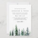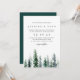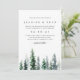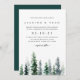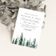 Uma queda elegante ou um convite de casamento no inverno apresenta uma cópia de árvores altas de pinheiros com aquarela em tons de idade cinza e verde caçador. Personalize com os detalhes do seu casamento em letras suaves de preto. Uma bela escolha para o outono ou casamentos no inverno elegantes em zonas de montanha, floresta ou floresta.