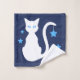 Um grupo de toalhas com um gato branco em um fundo dos azuis marinhos. As duas toalhas maiores têm o gato no canto com um teste padrão de estrela do azul do gelo no resto da toalha. O washcloth tem o gato como um design central.
