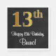 Este na moda, elegante e sofisticado design de guardanapo de papel com tema de aniversário apresenta um grande número ordinal "13" com um padrão de gradação falsa/imitado inspirado em ouro, juntamente com a mensagem de saudação de aniversário "Feliz aniversário do 13", e um nome personalizado em uma fonte estilo script. Também tem um fundo de cor preta. Os guardanapos de papel temáticos de aniversário luxuosos como este podem ser usados numa festa de aniversário para comemorar o aniversário de 13 de alguém. [~Z0000516]