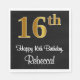 Este sofisticado, na moda, e elegante design de guardanapo de aniversário apresenta um grande número ordinal "16", com um padrão de gradação tipo ouro imitação/falsa, mais a mensagem de saudação de aniversário "Feliz 16.º Aniversário" e um nome personalizável em uma fonte estilo script. Também tem um fundo de cor preta. Os guardanapos de papel como este podem ser usados para celebrar o décimo sexto aniversário de alguém. [~Z0000516]