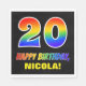 Este design de papel de aniversário colorido, divertido e alegre apresenta um grande número "20" e a mensagem "FELIZ ANIVERSÁRIO", ambos coloridos com um padrão inspirado no gradiente do espectro do arco-íris, juntamente com um nome de destinatário personalizado amarelo ousado. O fundo é preto colorido. Os guardanapos de papel divertidos e editáveis como este podem ser usados numa celebração de aniversário que está sendo realizada em honra do vigésimo aniversário de alguém. [~Z0000476]