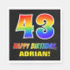 Este animado, colorido e divertido design de anotações de aniversário, napkin apresenta um grande número "43" e a mensagem "FELIZ ANIVERSÁRIO", ambos coloridos com um padrão inspirado no gradiente do espectro do arco-íris, junto com um nome ousado de destinatário personalizável amarelo. O fundo é preto colorido. Alguns guardanapos de papel personalizados e divertidos como este podem ser usados em uma festa para celebrar o quarenta e terceiro aniversário de alguém. [~Z0000476]