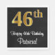 Este sofisticado, luxuoso e elegante design de guardanapo de papel temático de aniversário apresenta um grande número ordinal "46º", com uma imitação/aparência falsa de ouro, juntamente com a mensagem de saudação de aniversário "Feliz 46º aniversário" e um nome personalizado em uma fonte estilo script. O fundo é preto colorido. Os guardanapos de papel com tema de aniversário como este podem ser divertidos de usar numa festa de aniversário que está sendo realizada para alguém que está celebrando seus quarenta e seis anos. [~Z0000516]