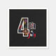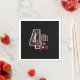 4 de julho, brilhante projeto de guardanapo de fogos de artifício. Fogos de artifício coloridos brilhantes dentro do número 4 num fundo preto a negrito. Julho é escrito em vermelho patriótico, branco e azul. Oferta de festa do dia da Independência perfeita.