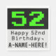 Este nerd design de guardanapo de papel, tema de aniversário, apresenta um grande número verde de jogos de 8 bits "52" em um fundo preto colorido. Também apresenta a mensagem de saudação de aniversário "Feliz 52º Aniversário", e um nome personalizado. Os guardanapos de bobo e papel geeky como este podem ser usados em uma festa em comemoração do 52º aniversário de um historiador de computação, um programador de computador, ou alguém que gosta de videos games retrorreflectores. [~Z0000404]