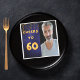 Um guardanapo para a festa de aniversário do cara 60th. Modelo para sua foto. Fundo azul escuro e o texto: até 60. O texto é escrito com um guião de balão de ouro falso de tendência. A cor azul escura é irregular. Com ouro confetti como decoração.