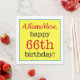 Este design de guardanapo de papel, tema de aniversário, que é impressionante, apresenta uma mensagem como "ANameHere, Happy 66th aniversário!", onde o nome e o número de aniversário podem ser personalizados. Os guardanapos de papel personalizados como estes podem ser usados na festa de aniversário de alguém.