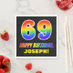 Este divertido, colorido e alegre design de guardanapo de papel temático de aniversário apresenta um grande número de "69" e a mensagem "FELIZ ANIVERSÁRIO", ambos coloridos com um padrão inspirado no gradiente do espectro do arco-íris, juntamente com um nome ousado de destinatário personalizável amarelo. O fundo é preto colorido. Divertido, guardanapos de papel personalizados como este podem ser usados na festa de 69 anos de alguém. [~Z0000476]
