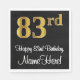 Este na moda, luxuoso e sofisticado design de guardanapo de papel de aniversário apresenta um grande número ordinal "83º", com uma aparência falsa e imitada de inspiração dourada, além da mensagem de saudação de aniversário "Feliz 83º Aniversário" e um nome personalizado numa letra estilo script. Também tem um fundo de cor preta. Os guardanapos de papel como este podem ser usados numa festa para alguém que comemora o seu oitenta e terceiro aniversário. [~Z0000516]