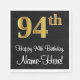 Este luxuoso, sofisticado e elegante design de guardanapo de aniversário apresenta um grande número ordinal "94º", com um padrão de gradação de imitação/falsa inspirado em ouro, juntamente com a mensagem de saudação de aniversário "Feliz 94º aniversário", e um nome personalizado em uma fonte estilo script. O fundo é preto colorido. Os guardanapos de papel temáticos de na moda de aniversário como este podem ser usados numa festa de aniversário celebrando o 94° aniversário de alguém. [~Z0000516]