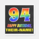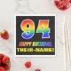 Este design de aniversário colorido, alegre e divertido apresenta um grande número "94" e a mensagem "FELIZ ANIVERSÁRIO", ambos coloridos com um padrão inspirado no gradiente do espectro do arco-íris, junto com um nome ousado de destinatário personalizado amarelo. O fundo é preto colorido. Os guardanapos de papel com tema de aniversário como este podem ser usados numa festa que comemora o 94º aniversário de alguém. [~Z0000476]