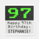 Este design de guardanapo de papel nerd e divertido, tema de aniversário, apresenta um grande número verde clássico de vídeo game, número "97" em um fundo preto colorido. Também apresenta a mensagem de saudação de aniversário "Feliz 97º Aniversário", e um nome personalizado. Os guardanapos de bobo e papel nerd como este podem ser usados em uma festa sendo realizada em comemoração do 97º aniversário de um programador de computador, um cientista, ou alguém que aprecia jogos clássicos de computador. [~Z0000404]