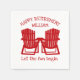 Que a diversão comece com essas cadeiras divertidas do Adirondack, guardanapos de aposentadoria em vermelho e branco. Alterar texto para qualquer ocasião.