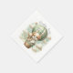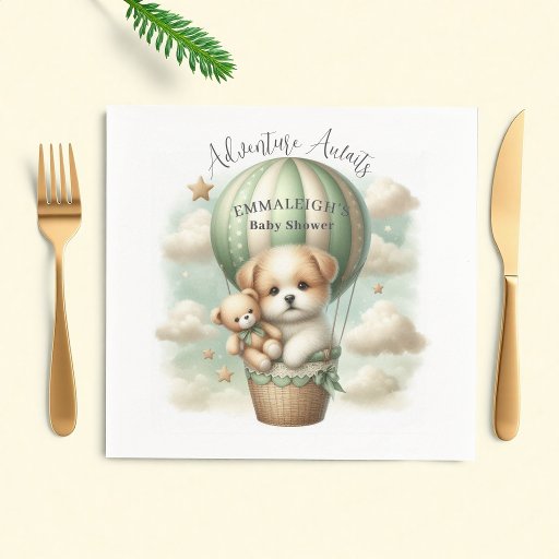 "Adventure Awaits" themed baby shower paper napkins with an adorable white and tan puppy holding a teddy bear riding in a green hot air balloon. The watercolor green sky has white clouds with surrounding gold stars. Template included.