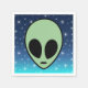 Uma cabeça alienígena verde com olhos ovais pretos grandes e uma pequena fenda preta para a boca. O fundo é uma cor de gradiente azul-escuro a claro, pontilhado com estrelas brancas.