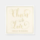 Os guardanapos de casamento apresentam um na moda dourado design de um roteiro de caligrafia "Cheers to Love" com um monograma personalizado.