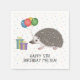 A ilustração original do desenho de Destei de um adorável animal africano Pygmy Hedgehog. O ouriço é fotografado de lado e ele está segurando balões coloridos de aniversário em sua boca. Há também dois presentes colocados em frente ao ouriço. Uma caixa atual é roxa e a outra é verde-lacrimejante. Ambos os presentes estão embrulhados com fita amarela. O fundo tem um padrão de confete pastel colorido sobre um fundo branco. Há também uma área de texto personalizável.