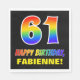 Este divertido, colorido e alegre design de papel de aniversário, guardanapo, apresenta um grande número "61" e a mensagem "FELIZ ANIVERSÁRIO", ambos coloridos com um padrão inspirado no gradiente do espectro do arco-íris, juntamente com um nome ousado de destinatário amarelo editável. O fundo é preto colorido. Divertido, aniversários editáveis guardanapos de papel como este podem ser usados na festa de sessenta e primeiro aniversário de alguém. [~Z0000476]