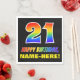 Este animado, divertido e colorido design de papel de aniversário, napkin, apresenta um grande número "21" e a mensagem "FELIZ ANIVERSÁRIO", ambos tendo um gradiente de padrão inspirado no espectro do arco-íris, juntamente com um nome ousado de destinatário personalizado amarelo. O fundo é preto colorido. Os guardanapos de papel com tema de aniversário como este podem ser divertidos de usar numa festa que está a ser realizada para celebrar o aniversário de 21 anos de alguém. [~Z0000476]