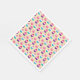 Os guardanapos coloridos têm um fundo amarelo pálido e um padrão de ricos cor-de-rosa, azul, branco e roxo, cupcakes, decorados com aspersão do arco-íris, morangos e cerejas.