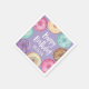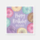Termine a decoração de festa de aniversário com esses bonitinhos guardanapos do tema da sobremesa, com "Feliz Aniversário [Nome]" em letras brancas, cercado por ilustrações de rosquinha de aquarela em rosa, roxo e aqua em fundo de lavanda.