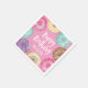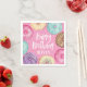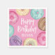Termine a decoração de festa de aniversário com esses bonitinhos guardanapos do tema da sobremesa, com "Feliz Aniversário [Nome]" em letras brancas, cercado por ilustrações de rosquinha de aquarela em rosa, roxo e aqua em fundo rosa.