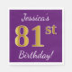 Este simples design de guardanapo de papel apresenta uma mensagem como "Aniversário de 81ruas de Jessica!", com a "81ruas" a ter uma aparência falsa de ouro, num fundo de cor púrpura. O nome pode ser personalizado. Pode ser usado em uma festa de aniversário para alguém que comemora seu oitenta aniversário. [~Z0000085]