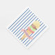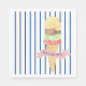 Este design delicioso tem listras azuis e brancas e apresenta um cone de sorvete com quatro alças de sorvete. A faixa cor-de-rosa diz: "Aqui está a colher".