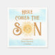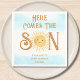 Estes guardanapos de papel de chá de fraldas de menino bonitinho apresentam o texto "Aqui Vem O Filho" em tipografia marrom na moda com uma cor amarela acastanhada e céu azul. Facilmente personalizável. Porque nós criamos a nossa trabalho de arte, você não encontrará esta imagem exata de outros designers. Original Watercolor © Michele Davies.