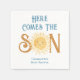 Estes guardanapos de papel de chá de fraldas apresentam o texto "Here Comes The Son" em tipografia azul-na moda e marrom com um sol sorridente de cor amarela e gira. Facilmente personalizável. Original Watercolor © Michele Davies.