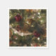 Fecho de uma árvore de Natal totalmente decorada, com borbulhas e ornamento de trompete, fita e luzes sobre produtos de festa e favores.