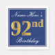 Este simples e elegante design de guardanapo de papel apresenta uma mensagem como "Name-Here's 92nd Birthday" (com o "92º" a ter uma cor falsa em forma de ouro) dentro de uma área quadrada de cor azul com um contorno de fronteira simples. O nome está em texto semelhante a script de cor branca e pode ser personalizado. Napkins como estes poderia talvez ser usado numa festa de aniversário para alguém que comemora seu nonagésimo segundo aniversário. [~Z0000141]