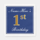 Este simples e elegante design de guardanapo de papel apresenta uma mensagem como "primeiro aniversario do nome-aqui" (com as "1ruas" com uma coloração falsa em ouro) dentro de uma área quadrada de cor azul com um contorno de fronteira simples. O nome está em texto semelhante a script de cor branca e pode ser personalizado. Napkins como estes poderia talvez ser usado numa festa de aniversário para alguém que comemora seu primeiro aniversário. [~Z0000141]