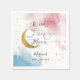 Garoto sonhador e guardanapo cor-de-rosa apresentando textura aquosa em azul e rosa no dorso com lua reluzente e estrelas. O texto diz "estamos sobre a lua."