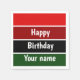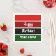 Um padrão horizontal vermelho e verde riscado e o texto: Feliz Aniversário. Você pode clicar em personalizar e editar o texto. Escreva duas palavras em uma linha.