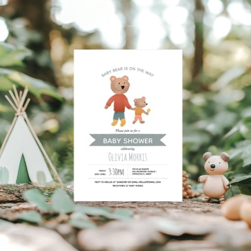 Este design de guardanapo chá de fraldas de bebê bonito e moderno apresenta um urso parente e bebê. Também há espaço para você adicionar o nome da mãe e a data da sua festa na floresta.