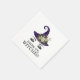 Os guardanapos ideais para a sua festa de Halloween ou despedida de solteira com tema de Halloween. Apresenta um rosto de bruxa fofo (um chapéu de bruxa roxo com um buquê branco e dourado sobre um par de sobrancelhas arqueadas e pálpebras maquiadas com glitter prateado). Abaixo, o texto preto lê "Bebam até o fim, bruxas!" em uma fonte adequadamente assustadora.