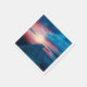 Guardanapos de papel com uma bela fotografia. Um lugar cênico. Um lago tranquilo com uma doca de madeira que se estende para fora. Definir o sol fornece lindas cores no céu, vermelho e azul vibrantes.