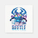 Veja este gráfico de estilo retrowave do Besouro Azul com o pôr do sol sobre a cidade!
