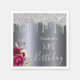 Um guardanapo para a 50ª festa de aniversário. Um fundo metálico de aspecto prateado escuro. Decorado com púrpura escura e flores cor-de-rosa-burro e rosa, brilho fino prateado, aparência de pingar tinta. Modelos para um nome. O texto: 50º Aniversário é escrito com um grande estilo escrito à mão.