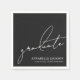 This simple and modern graduation party paper napkin features a clean black background with white fonts for a timeless, gender-neutral look that works beautifully for both boys and girls. All text is neatly placed in the bottom right corner for a sleek, understated style. “Graduate” appears in elegant handwritten script, paired with the graduate’s name, “Class of 2026” (or any year), and school name in classic serif fonts.