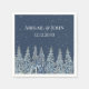 An elegant custom napkin for your rustic winter wedding table with a snow covered forest at night in navy blue and white.