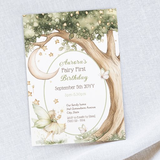 Add some party supply to your magical milestone celebration in this charming theme with this whimsical fairy first napkins. Adorned with soft watercolor sweet fairy standing by an old big tree. Details of stars and the moon creates a dreamy enchanted forest vibe. With elegant fonts, a sage green and ivory palette, a truly charming and magical celebration.